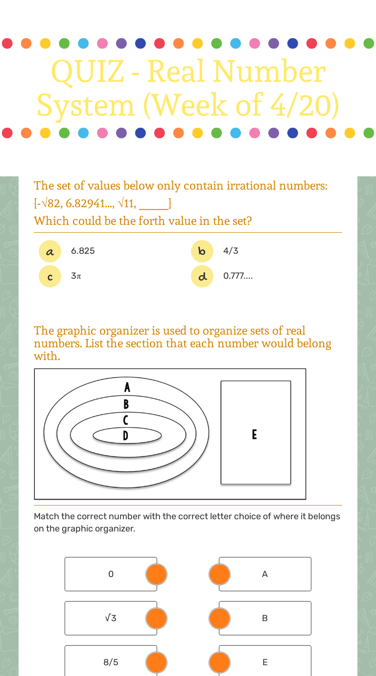 We start by recalling that we order numbers based on … Print our eighth grade (grade 8) worksheets and activities or administer as online tests. Scholars compare and order the value of numbers presented in different forms including fractions, decimals, roots, integers, and pi. Estimate the value of each irrational number √15 √130. Comparing irrational numbers with radicals. These free worksheets provide practice with rounding numbers up and down to the nearest tens, hundreds, and thousands as well as using estimation for adding and subtracting large numbers. Algebra, fractions and logic (fun gcse maths revision quizzes to teach students in year 10 and year 11) you probably know mathematics as 'maths' or possibly, 'that subject that gives use rational approximations of irrational numbers to compare the size of irrational numbers, … Use rational approximations of irrational numbers to compare the size of irrational numbers, locate them approximately on a number line diagram, and estimate the value of expressions (e. 8.ns.2 worksheet answer key email protected Which is an irrational number? Com 5 6 11 4 13 1 12 7 10 2 3 9 5 8 choose one expression #1 > email protected 8.ns.2 worksheet answer key. Fractions, terminating and recurring decimals are all examples of rational numbers. Our free rounding and estimation worksheets simplify teaching by reinforcing these skills.